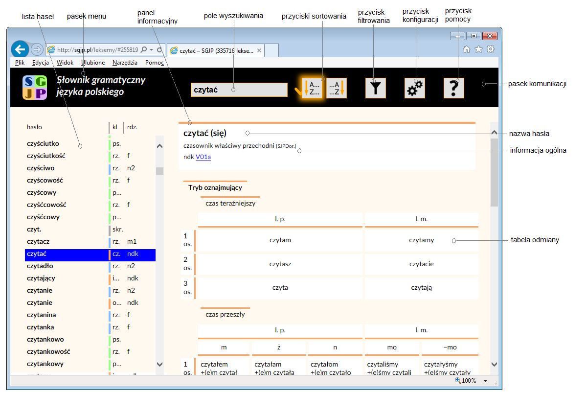 Strona WWW internetowej wersji Słownika gramatycznego języka polskiego dzieli się na trzy zasadnicze części. Górną część stanowi pasek narzędziowy, pod którym w lewej części ekranu znajduje się panel listy haseł, a w prawej — panel artykułu hasłowego.