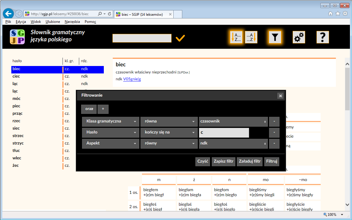 Zawartość listy wzorów, podobnie jak listy leksemów, można dostosować do swych potrzeb za pomocą filtru. Podobnie można łączyć kryteria filtrowania (alternatywnie lub koniunkcyjnie) oraz tworzyć alternatywy wartości w wypadku kryteriów zamkniętych.